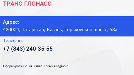 ТРАНС-ГЛОНАСС по адресу 420004, Татарстан, Казань, Горьковское шоссе, 53а в дальнейшем Организация, размещена в следующих категориях: