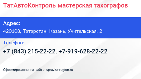 ТатАвтоКонтроль, мастерская тахографов по адресу 420108, Татарстан, Казань, Учительская, 2 в дальнейшем Организация, размещена в следующих категориях:
