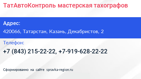 ТатАвтоКонтроль, мастерская тахографов по адресу 420066, Татарстан, Казань, Декабристов, 2 в дальнейшем Организация, размещена в следующих категориях: