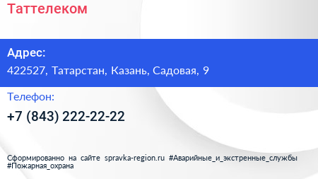Таттелеком по адресу 422527, Татарстан, Казань, Садовая, 9 в дальнейшем Организация, размещена в следующих категориях: