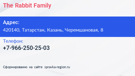 The Rabbit Family по адресу 420140, Татарстан, Казань, Черемшановая, 8 в дальнейшем Организация, размещена в следующих категориях: