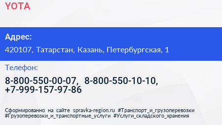 YOTA по адресу 420107, Татарстан, Казань, Петербургская, 1 в дальнейшем Организация, размещена в следующих категориях: