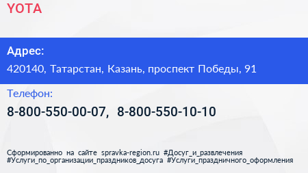 YOTA по адресу 420140, Татарстан, Казань, проспект Победы, 91 в дальнейшем Организация, размещена в следующих категориях: