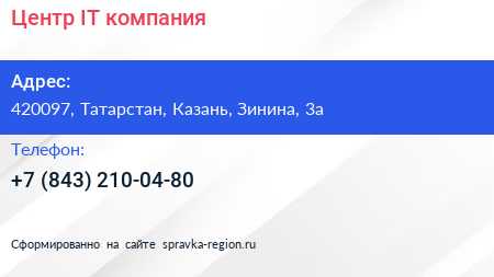 Центр, IT-компания по адресу 420097, Татарстан, Казань, Зинина, 3а в дальнейшем Организация, размещена в следующих категориях: