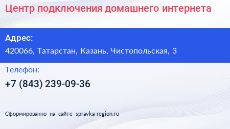 Центр подключения домашнего интернета по адресу 420066, Татарстан, Казань, Чистопольская, 3 в дальнейшем Организация, размещена в следующих категориях: