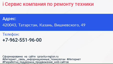 i-Сервис, компания по ремонту техники по адресу 420043, Татарстан, Казань, Вишневского, 49 в дальнейшем Организация, размещена в следующих категориях: