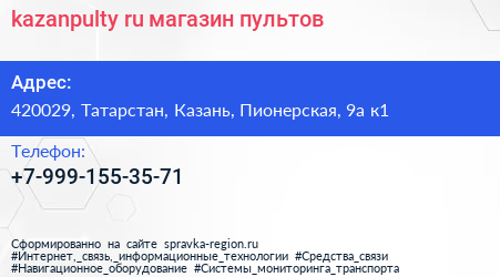kazanpulty.ru, магазин пультов по адресу 420029, Татарстан, Казань, Пионерская, 9а к1 в дальнейшем Организация, размещена в следующих категориях: