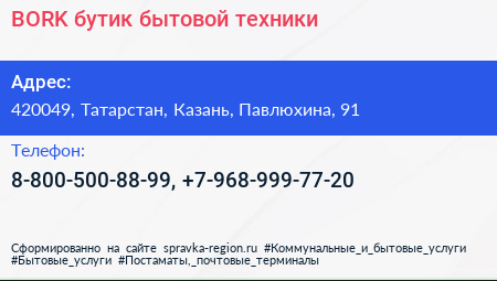 BORK, бутик бытовой техники по адресу 420049, Татарстан, Казань, Павлюхина, 91 в дальнейшем Организация, размещена в следующих категориях: