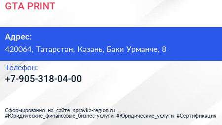 GTA PRINT по адресу 420064, Татарстан, Казань, Баки Урманче, 8 в дальнейшем Организация, размещена в следующих категориях:
