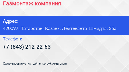 Газмонтаж, компания по адресу 420097, Татарстан, Казань, Лейтенанта Шмидта, 35а в дальнейшем Организация, размещена в следующих категориях: