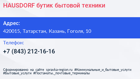 HAUSDORF, бутик бытовой техники по адресу 420015, Татарстан, Казань, Гоголя, 10 в дальнейшем Организация, размещена в следующих категориях: