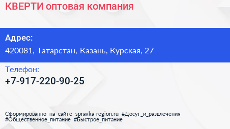 КВЕРТИ, оптовая компания по адресу 420081, Татарстан, Казань, Курская, 27 в дальнейшем Организация, размещена в следующих категориях: