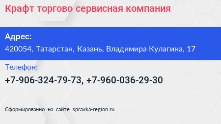 Крафт, торгово-сервисная компания по адресу 420054, Татарстан, Казань, Владимира Кулагина, 17 в дальнейшем Организация, размещена в следующих категориях: