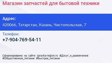 Магазин запчастей для бытовой техники по адресу 420066, Татарстан, Казань, Чистопольская, 7 в дальнейшем Организация, размещена в следующих категориях:
