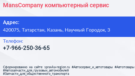 MansCompany, компьютерный сервис по адресу 420075, Татарстан, Казань, Научный Городок, 3 в дальнейшем Организация, размещена в следующих категориях: