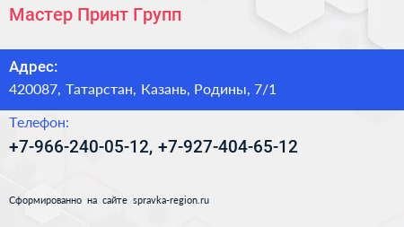 Мастер Принт Групп по адресу 420087, Татарстан, Казань, Родины, 7/1 в дальнейшем Организация, размещена в следующих категориях: