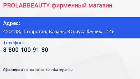 PROLABBEAUTY, фирменный -магазин по адресу 420138, Татарстан, Казань, Юлиуса Фучика, 14в в дальнейшем Организация, размещена в следующих категориях: