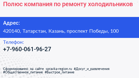 Полюс, компания по ремонту холодильников по адресу 420140, Татарстан, Казань, проспект Победы, 100 в дальнейшем Организация, размещена в следующих категориях: