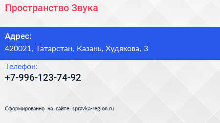 Пространство Звука по адресу 420021, Татарстан, Казань, Худякова, 3 в дальнейшем Организация, размещена в следующих категориях: