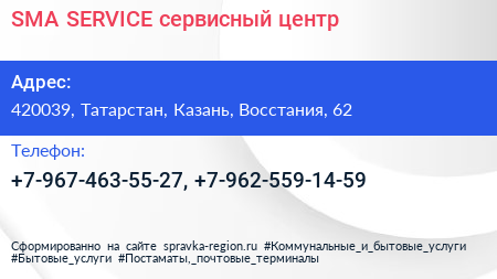 SMA SERVICE, сервисный центр по адресу 420039, Татарстан, Казань, Восстания, 62 в дальнейшем Организация, размещена в следующих категориях: