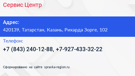 Сервис Центр по адресу 420139, Татарстан, Казань, Рихарда Зорге, 102 в дальнейшем Организация, размещена в следующих категориях: