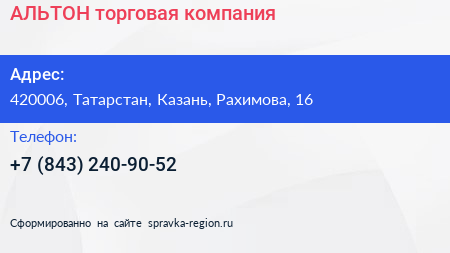 АЛЬТОН, торговая компания по адресу 420006, Татарстан, Казань, Рахимова, 16 в дальнейшем Организация, размещена в следующих категориях: