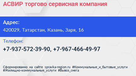 АСВИР, торгово-сервисная компания по адресу 420029, Татарстан, Казань, Заря, 16 в дальнейшем Организация, размещена в следующих категориях:
