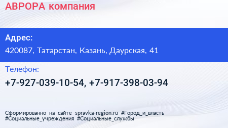 АВРОРА, компания по адресу 420087, Татарстан, Казань, Даурская, 41 в дальнейшем Организация, размещена в следующих категориях: