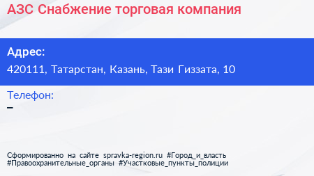 АЗС Снабжение, торговая компания по адресу 420111, Татарстан, Казань, Тази Гиззата, 10 в дальнейшем Организация, размещена в следующих категориях: