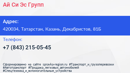 Ай-Си-Эс Групп по адресу 420034, Татарстан, Казань, Декабристов, 81Б в дальнейшем Организация, размещена в следующих категориях: