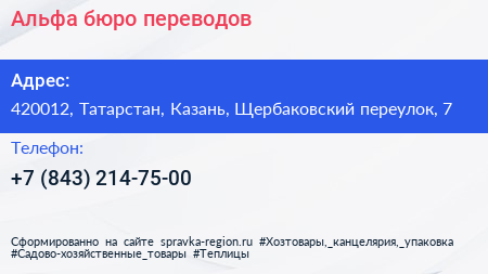 Альфа, бюро переводов по адресу 420012, Татарстан, Казань, Щербаковский переулок, 7 в дальнейшем Организация, размещена в следующих категориях: