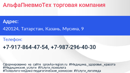 АльфаПневмоТех, торговая компания по адресу 420124, Татарстан, Казань, Мусина, 9 в дальнейшем Организация, размещена в следующих категориях: