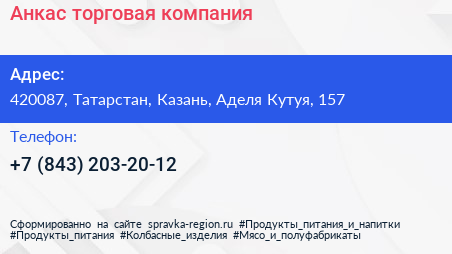 Анкас, торговая компания по адресу 420087, Татарстан, Казань, Аделя Кутуя, 157 в дальнейшем Организация, размещена в следующих категориях: