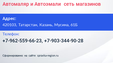 Автомаляр и Автоэмали+, сеть магазинов по адресу 420103, Татарстан, Казань, Мусина, 61Б в дальнейшем Организация, размещена в следующих категориях: