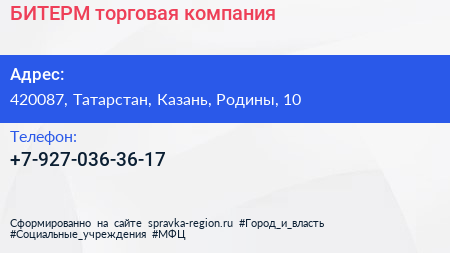 БИТЕРМ, торговая компания по адресу 420087, Татарстан, Казань, Родины, 10 в дальнейшем Организация, размещена в следующих категориях: