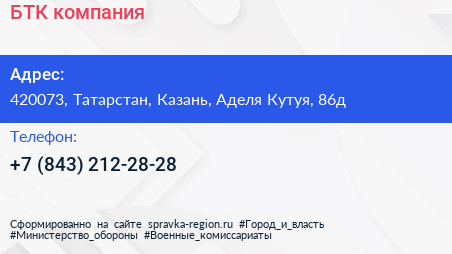 БТК, компания по адресу 420073, Татарстан, Казань, Аделя Кутуя, 86д в дальнейшем Организация, размещена в следующих категориях: