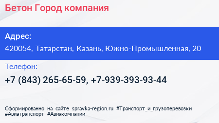 Бетон Город, компания по адресу 420054, Татарстан, Казань, Южно-Промышленная, 20 в дальнейшем Организация, размещена в следующих категориях: