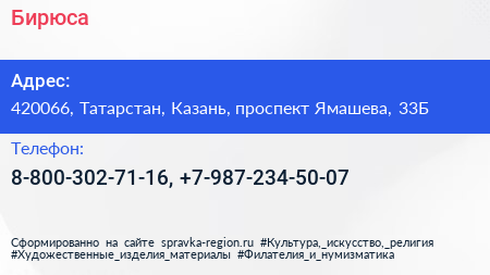 Бирюса по адресу 420066, Татарстан, Казань, проспект Ямашева, 33Б в дальнейшем Организация, размещена в следующих категориях: