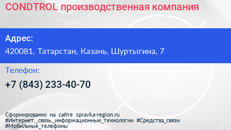 CONDTROL, производственная компания по адресу 420081, Татарстан, Казань, Шуртыгина, 7 в дальнейшем Организация, размещена в следующих категориях: