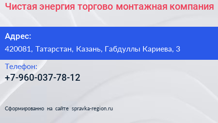 Чистая энергия, торгово-монтажная компания по адресу 420081, Татарстан, Казань, Габдуллы Кариева, 3 в дальнейшем Организация, размещена в следующих категориях: