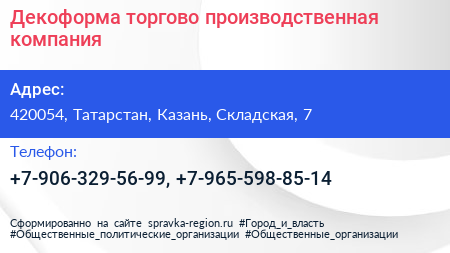 Декоформа, торгово-производственная компания по адресу 420054, Татарстан, Казань, Складская, 7 в дальнейшем Организация, размещена в следующих категориях: