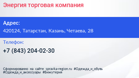 Энергия, торговая компания по адресу 420124, Татарстан, Казань, Четаева, 28 в дальнейшем Организация, размещена в следующих категориях: