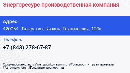 Энергоресурс, производственная компания по адресу 420054, Татарстан, Казань, Техническая, 120а в дальнейшем Организация, размещена в следующих категориях: