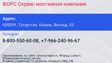 ФОРС-Сервис, монтажная компания по адресу 420039, Татарстан, Казань, Восход, 43 в дальнейшем Организация, размещена в следующих категориях: