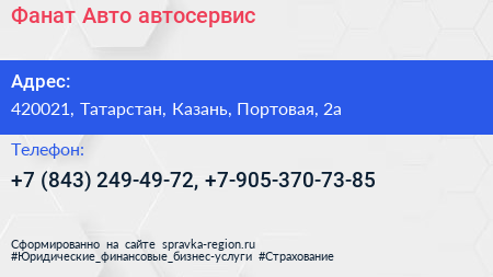 Фанат-Авто, автосервис по адресу 420021, Татарстан, Казань, Портовая, 2а в дальнейшем Организация, размещена в следующих категориях: