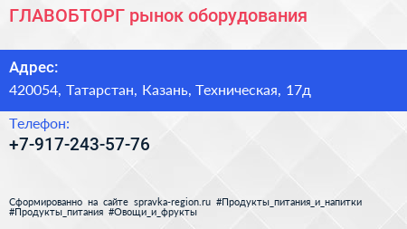 ГЛАВОБТОРГ, рынок оборудования по адресу 420054, Татарстан, Казань, Техническая, 17д в дальнейшем Организация, размещена в следующих категориях: