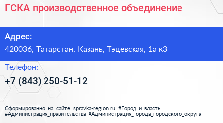 ГСКА, производственное объединение по адресу 420036, Татарстан, Казань, Тэцевская, 1а к3 в дальнейшем Организация, размещена в следующих категориях: