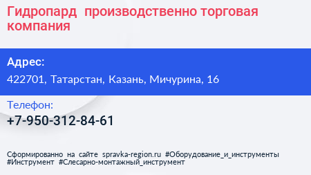Гидропард+, производственно-торговая компания по адресу 422701, Татарстан, Казань, Мичурина, 16 в дальнейшем Организация, размещена в следующих категориях: