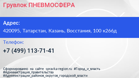 Грувлок ПНЕВМОСФЕРА по адресу 420095, Татарстан, Казань, Восстания, 100 к266д в дальнейшем Организация, размещена в следующих категориях: