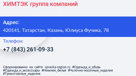ХИМТЭК, группа компаний по адресу 420141, Татарстан, Казань, Юлиуса Фучика, 78 в дальнейшем Организация, размещена в следующих категориях: